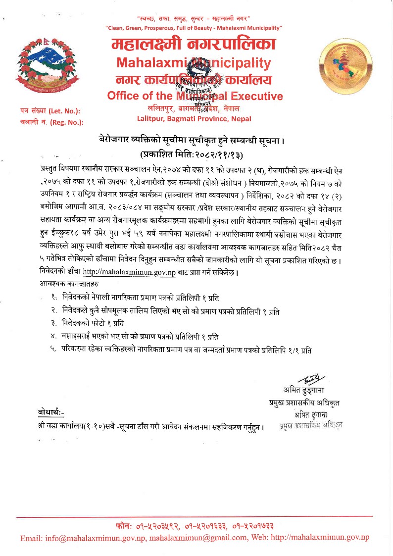बेरोजगार व्यतिको सुचिमा सुचिकृत हुने सम्बन्धमा प्रकाशित मिति २०८२/११/१३