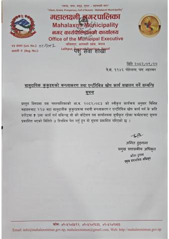 about सामुदायिक कुकुरहरुको बन्ध्याकरण तथा एन्टीरेविज खोप कार्य संचालन गर्ने सम्बन्धि सुचना प्रकाशित मिति २०८२/०९/२०