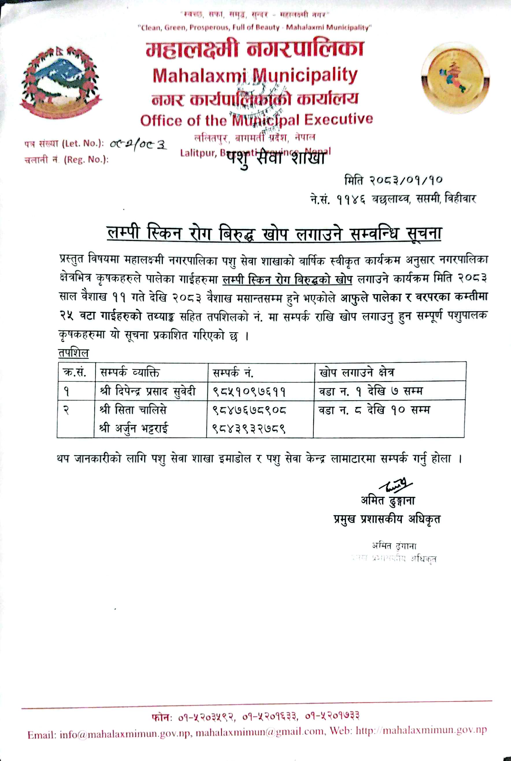 » लम्पी स्किन रोग विरुद्धको खोप लगाउने सम्बन्धी सुचना प्रकाशित मति २०८३/०१/१०