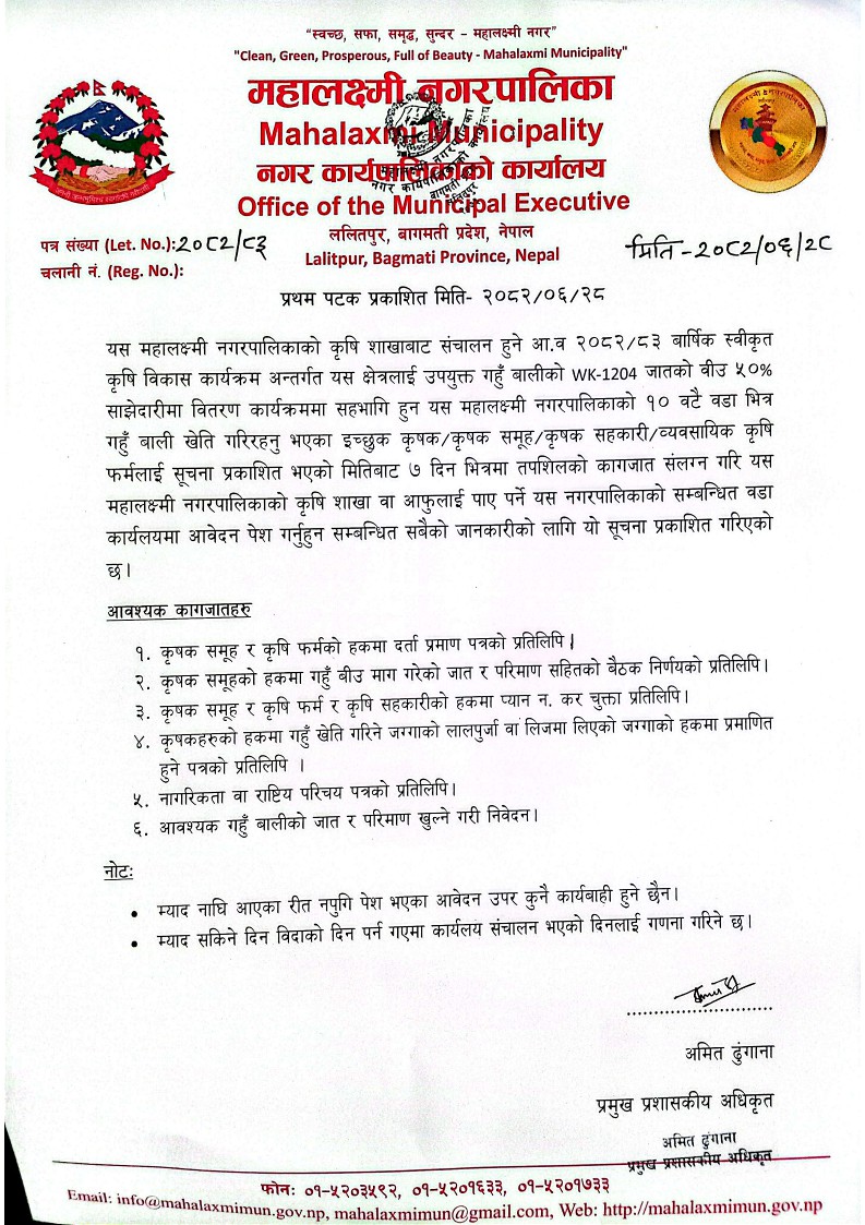 कृषि शाखाको सुचना प्रकाशित मिति २०८२/०६/२८