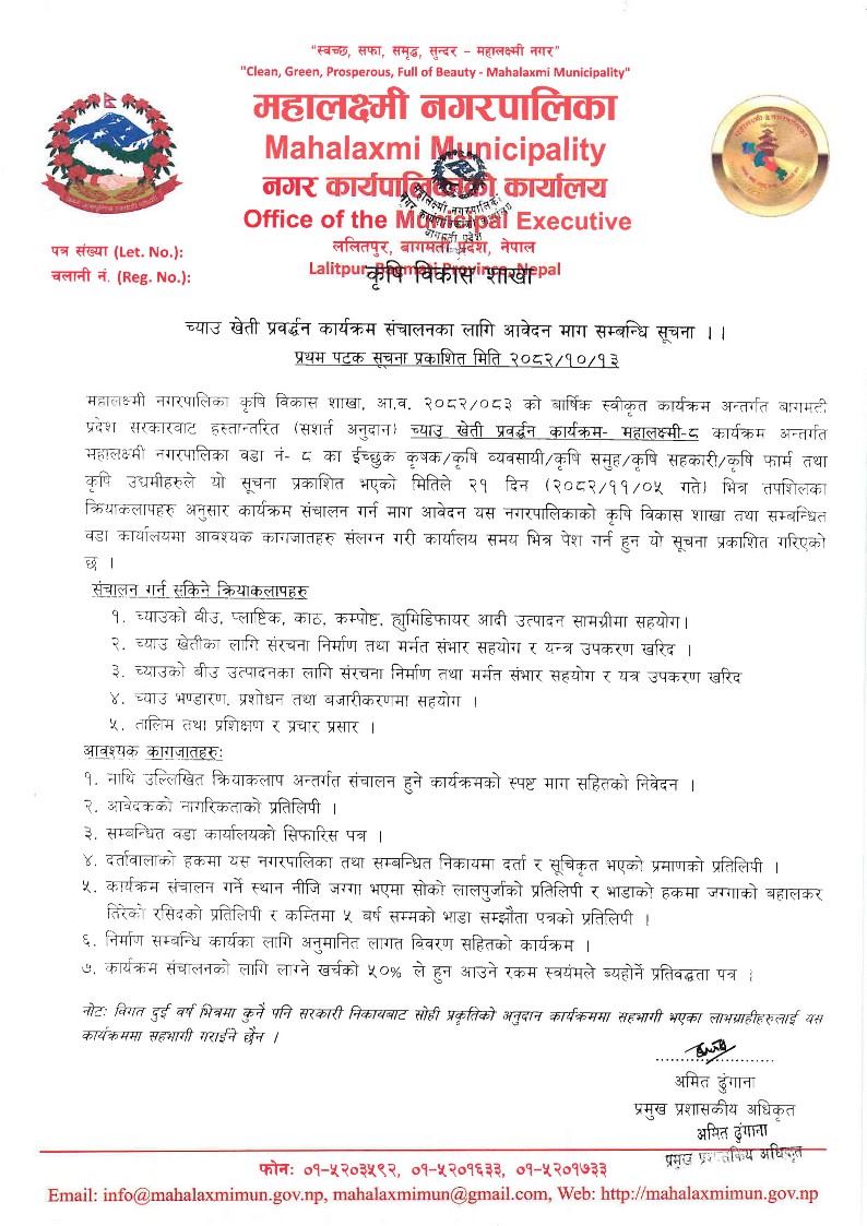 च्याउ खेति प्रवर्द्धन कार्यक्रम संचालनका लागि आवेदन माग सम्बन्धी सुचना प्रथम पटक प्रकाशित मिति २०८२/१०/१३