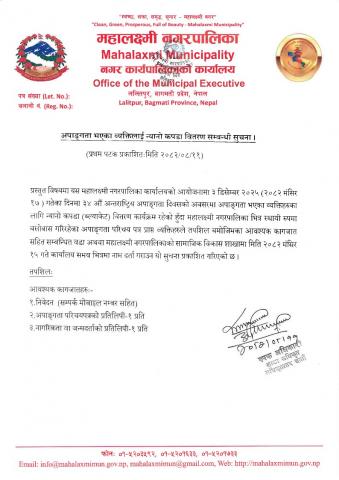 अपाङ्गता भएका व्यक्तिलाई न्यानो कपडा वितरण सम्बन्धि सुचना प्रकाशित मिति २०८२/०८/११