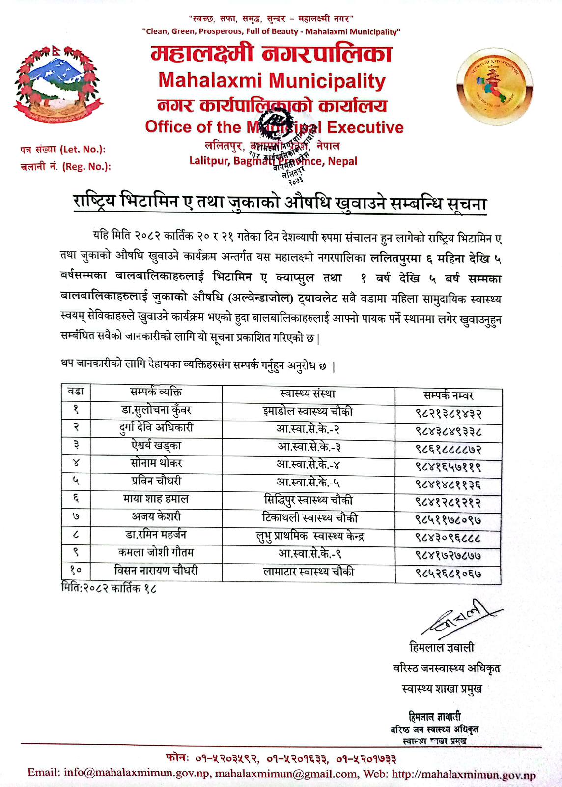 राष्ट्रिय भिटामिन ए तथा जुकाको औषधि खुवाउने खुवाउने सम्बन्धी सुचना
